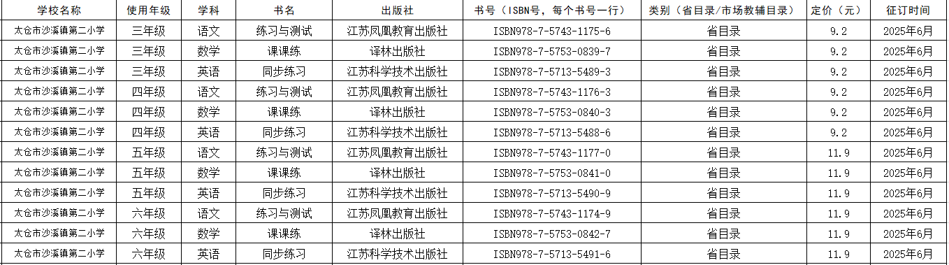 沙二小2025-2026学年第一学期 学期教辅材料选用公示