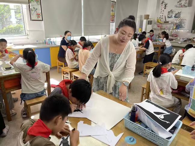 2025.9.25日上午第二节课,吴佳男老师执教四年级美术教研课《唱起来跳起来》,本节课以傣族孔雀舞为主题的漏印版画课程,是一节融合了民族文化、艺术创作与科技应用的生动实践。教师通过创设“艺术社团招新”的真实情境,激发学生的参与热情,再借助VR技术实现沉浸式观赏,迅速将学生带入艺术氛围中,体现了教学手段的现代性与创新性。