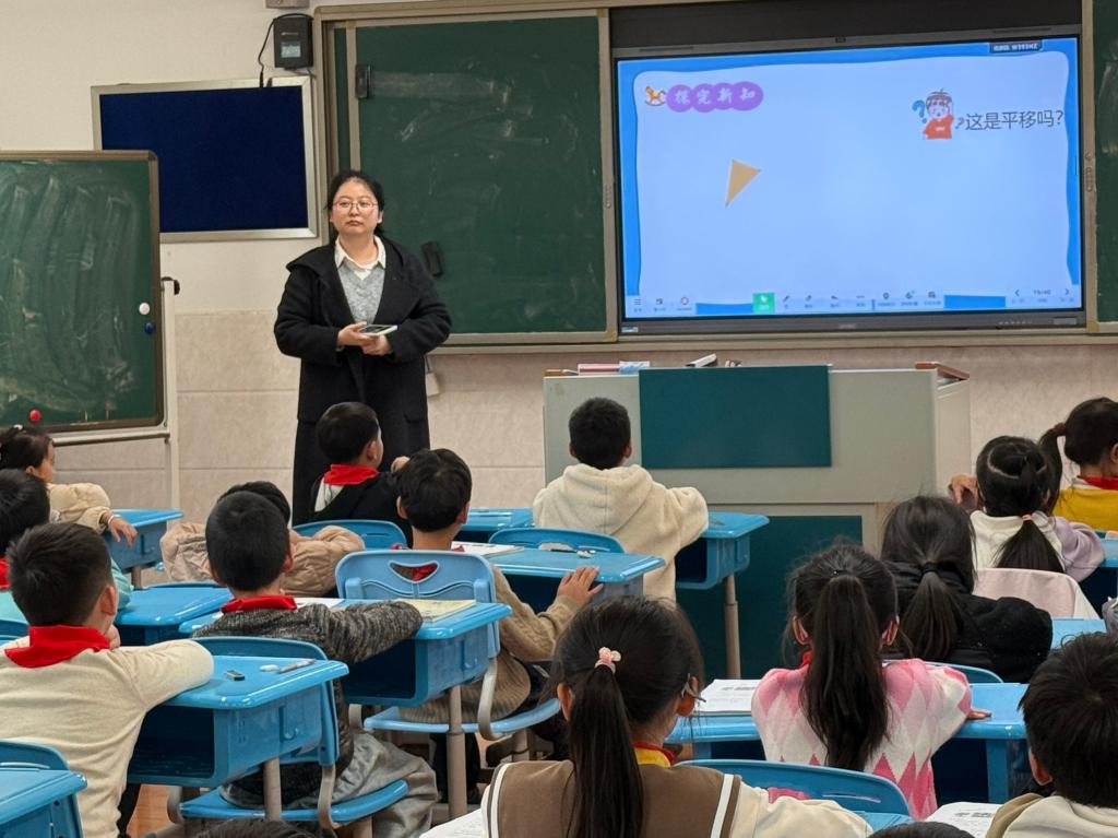 2025年11月17日,我校沈邵祎老师在观摩教室2执教校本教研课——《平移和旋转》。沈老师本节课以游乐园情境导入,引导学生分类感知平移与旋转;在探究两类现象的过程中,结合生活实例、直观演示与动手操作,明确平移“形状、方向、大小不变,位置改变”和旋转“形状、大小不变,方向、位置改变”的核心特征,讲解旋转方向。通过对比总结深化异同认知,再经多层练习巩固应用,结合建筑实例拓展延伸,最后梳理总结,贴合三年级学生认知规律,落实空间观念的核心素养。