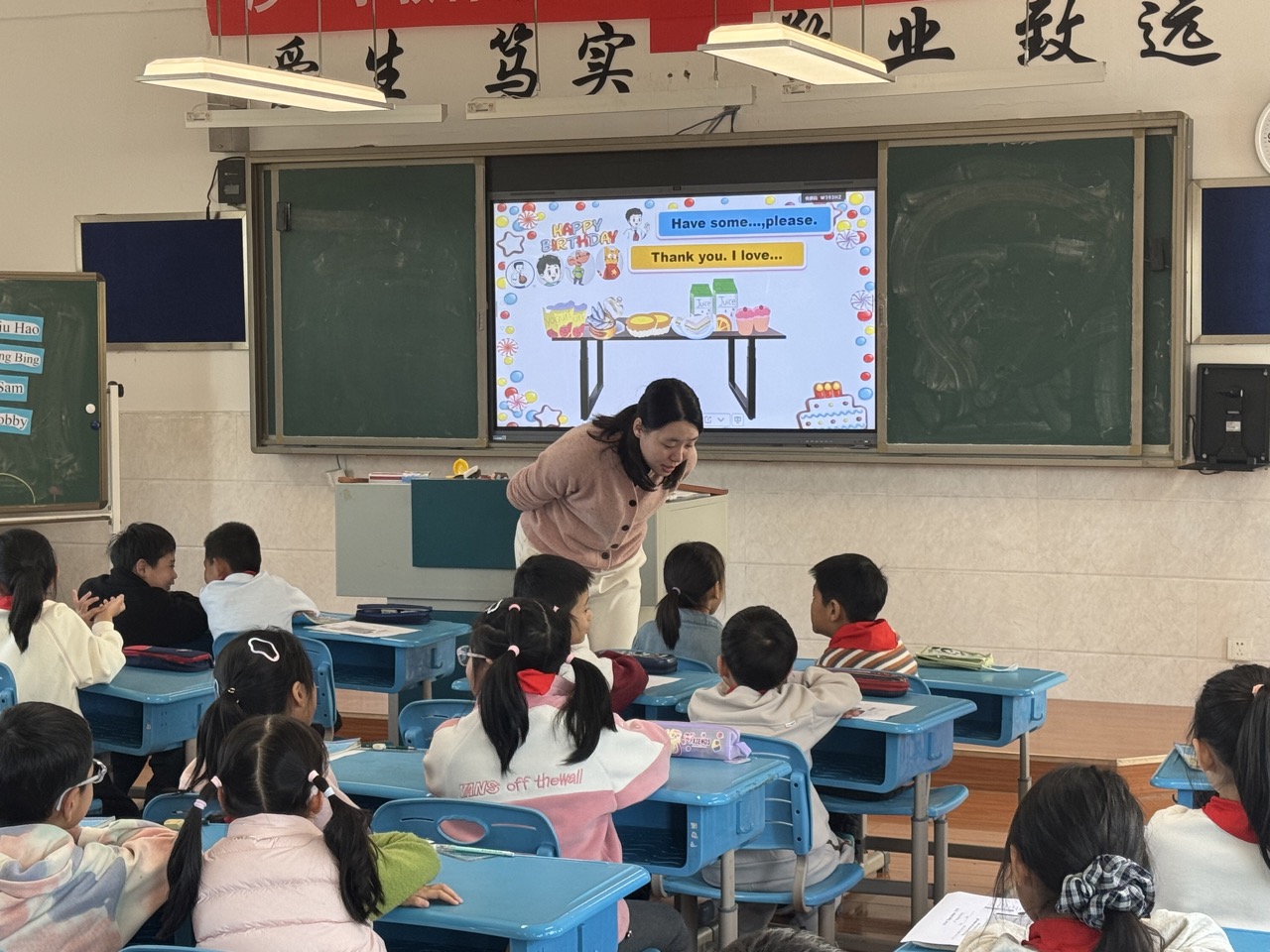 11月13日下午第二节课,沙二小李莹燕副校长带来三年级Unit7《Happy Birthday》读写融合课。课堂围绕生日主题,通过数字复习、情景对话、任务型活动等多种方式,激发学生表达欲望。学生在“Game Time”、“Tea Time”、“Party Time”等环节中积极互动,真实运用语言,展现了良好的课堂参与度和语言综合运用能力。