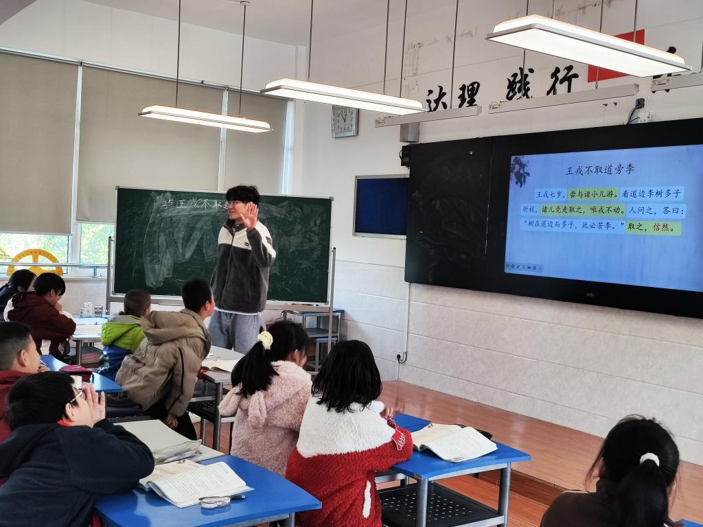 2025年11月18日下午,顾志杰老师在观摩教室一执教教研课《王戎不取道旁李》。课堂上,顾老师通过“信息提取、方法回顾、分层朗读、语义辨析、思维探究”,将《王戎不取道旁李》的教学拆解为“懂字词、明文意、悟智慧”三个层次。学生们通过小组交流厘清“之”的用法,对比同伴与王戎的不同表现提炼人物特质,让文言学习从被动变成主动参与。教研组将梳理反思本次教研课的内容,让传统文言文本既“教得扎实”,更“学得有趣”,真正成为学生语文素养生长的养分。