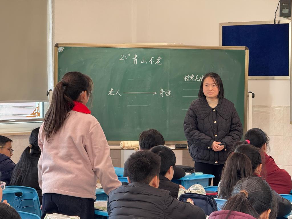 2025年11月25日下午,顾丽吉老师在观摩教室执教教研课《青山不老》。课堂以“检索关键信息、品读重点词句、学会归纳概括、解读一语双关” 为核心思路,围绕晋西北植树老人的故事展开教学。通过导入环节铺垫背景,引导学生快速把握课文主要内容;随后设置三大任务,分别探究老人创造的植树奇迹、奇迹背后的艰难环境及 “青山不老” 的深层内涵,借助词句赏析、数字解读、环境衬托等方式,凸显老人无私奉献、顽强执着的品质;最后结合单元主题升华情感,呼吁学生践行环保理念。课后作业还设计了拓展阅读与观察插图的作业,兼顾知识学习与价值引领,逻辑清晰且注重学生能力培养。