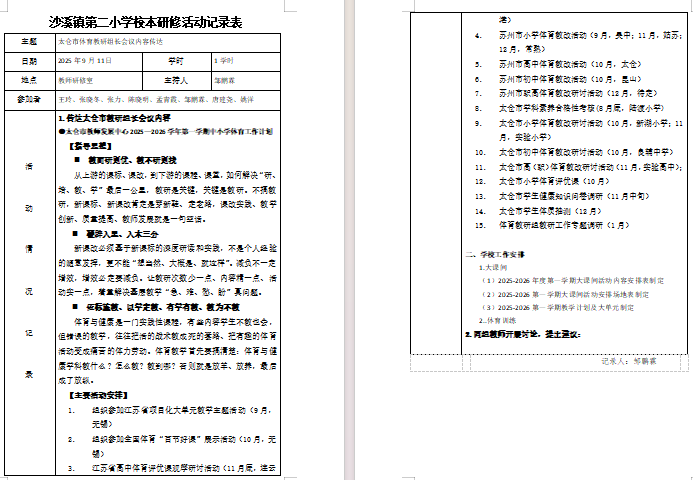 2025年9月11日上午,体育组成员们在教师研修室一起听邹鹏霖老师传达了有关太仓市教研组长会议的内容;会议上指出抓好常规课;强化体育课上好作风、正能量、好气场。当前体育课改四句话,教而研则优,教不研则浅;鞭辟入里,入木三分;依标施教、以学定教、有学有教、教为不教;先有课程,再有课堂;先看课堂,再谈质量。