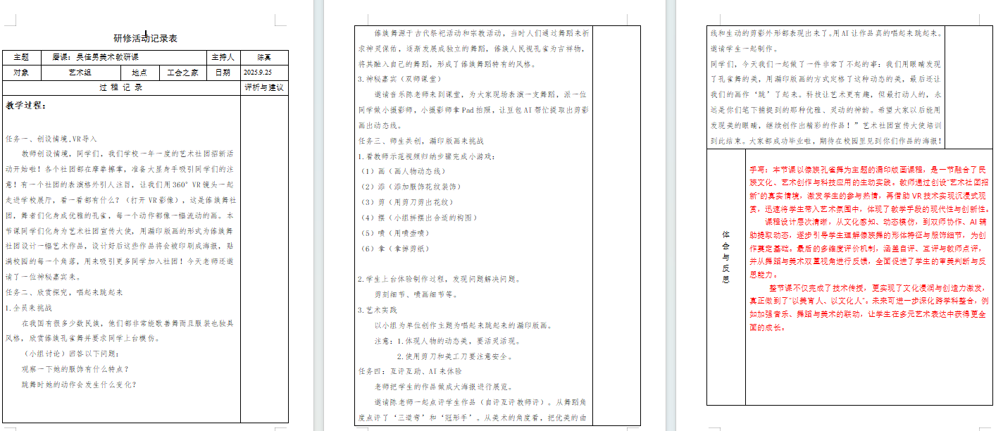 2025年9月25日,我们艺术组教师围绕吴老师的《唱起来跳起来》展开深度磨课。本节课以傣族孔雀舞为主题的漏印版画课程,是一节融合了民族文化、艺术创作与科技应用的生动实践。整节课不仅完成了技术传授,更实现了文化浸润与创造力激发,真正做到了“以美育人、以文化人”。未来可进一步深化跨学科整合,例如加强音乐、舞蹈与美术的联动,让学生在多元艺术表达中获得更全面的成长。