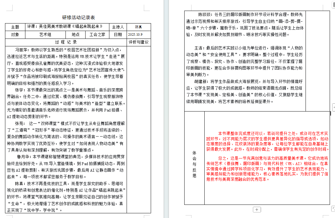 2025年10月9日我们艺术组教师围绕吴老师的《唱起来跳起来》展开深度评课。这是一节充满创意与活力的高质量美术课。它成功地将传统艺术(傣族舞、漏印版画)与现代科技(VR、AI)相结合,在真实情境中通过跨学科项目化学习,有效提升了学生的艺术表现能力、审美感知能力和创新思维能力,核心素养落地扎实,为我们提供了信息技术与美育深度融合的优秀范本。