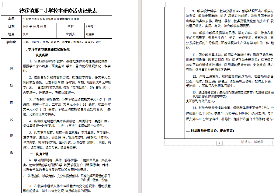2025年10月16日,体育组成员在队室一起学习了太仓市义务教育体育与健康课程标准中有关教学六认真的内容,并指出认真备课、认真上课、认真批改作业、认真辅导、认真考核、认真组织课外活动。