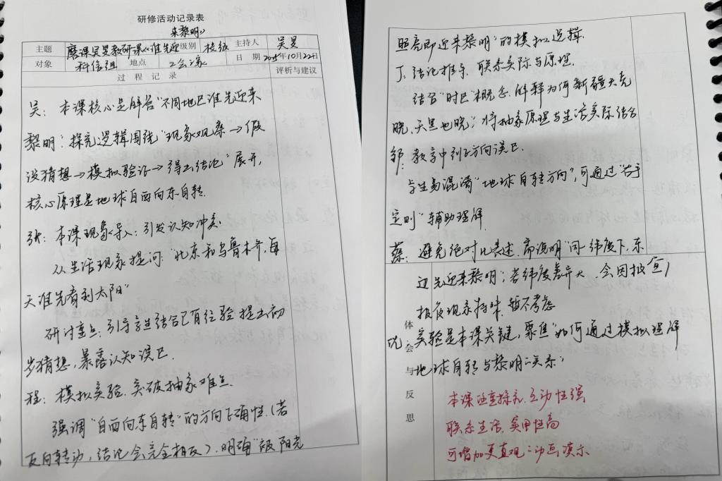 科信组针对吴旻老师教六年级下册教研课《谁先迎来黎明》一课展开研讨,科信组首先围绕课堂优势展开分析,提炼可推广的教学方法:针对 “地球自转导致昼夜交替” 这一抽象概念,吴旻老师设计了“模拟地球仪实验”:用带刻度的地球仪代表地球,手电筒模拟太阳,让学生分组操作 —— 将北京、乌鲁木齐标注在地球仪对应经度上,转动地球仪观察两地 “迎来黎明” 的先后顺序。教具的使用让学生能直观说出 “东边先亮”,有效降低了地理空间思维的门槛。