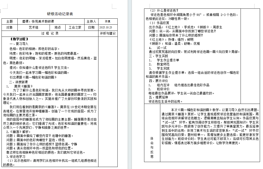 2025年10月23日,我们艺术组教师围绕张老师的《画一幅色彩和谐的画》展开深度磨课。本节课以复习导入自然引出课题,通过莫奈《睡莲》赏析,让学生直观感受邻近色营造的和谐氛围,再结合色相环讲解邻近色概念,逻辑清晰且贴合学生认知。作品欣赏与 “试一试” 环节,能有效调动学生积极性,帮助其巩固知识;学生实践与多元评价,既锻炼了创作能力,又提升了审美鉴赏力,最后延伸到生活中的运用,体现了美术与生活的紧密联系。