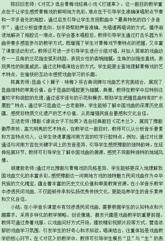 2025年11月13日,音乐组的老师们进行了一次集体备课研讨活动,本次活动围绕“在小学音乐课堂中有效渗透民间戏曲的实践”开展。老师们从豫剧、黄梅戏、昆曲等相关教学课例入手,通过细致研磨在课堂中的如何落实渗透,引领学生体验民间戏曲作为中华民族的文化瑰宝,蕴含着丰富的历史文化价值和审美教育资源。在小学音乐教学中渗透民间戏曲,不仅能够传承和弘扬优秀传统文化,更能培养学生的音乐素养和文化自信。