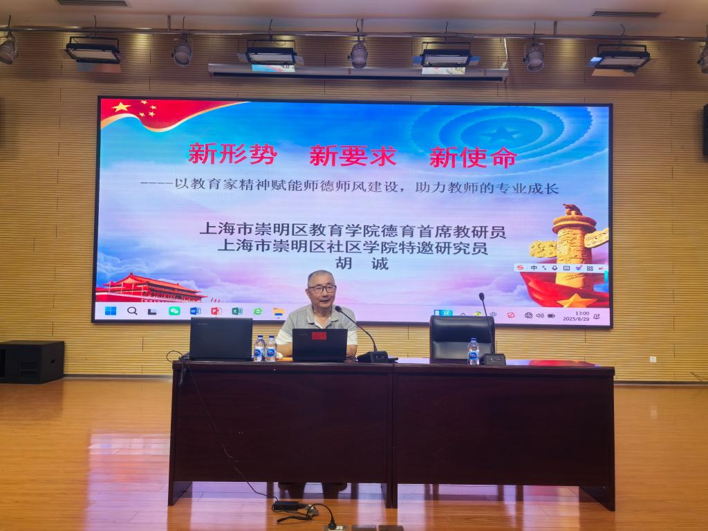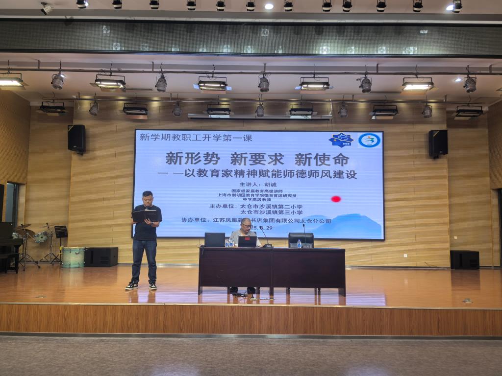 2025年8月29日下午,太仓市沙溪镇第二小学与太仓市沙溪镇第三小学联合举办的 《新形势 新要求 新使命——以教育家精神赋能师德师风建设》专题培训活动在沙二小求真厅顺利开展。此次活动特别邀请上海市崇明区教育学院德育首席研究员、中学高级教师、国家级家庭教育高级讲师胡诚进行专题讲座,为两校教师带来了一场思想盛宴。