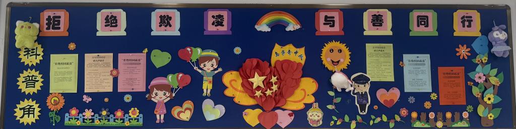 黑板报作为班级文化的“主阵地”,成为各年级特色主题的生动载体。一年级以“言行守规,礼仪润心”为核心,用卡通插画呈现文明用语、排队守序等场景,将行为规范教育变得直观有趣;二年级围绕“书香伴读,启智成长”主题,绘制经典名著片段、读书名言,搭配学生自制的读书卡片,营造出浓厚的阅读氛围;三年级聚焦“安全护行,远离危险”,通过交通标志、消防器材、防溺水场景的手绘设计,将安全知识清晰传递;四年级结合“科技筑梦,爱国力行”,用航天模型、科技发明示意图与爱国人物事迹相结合的版面,激发学生的科学探索精神与爱国情怀;五年级以“拒绝欺凌,友善同行”为主题,通过漫画故事展现欺凌危害与友善相处的重要性,传递温暖向上的班级氛围;六年级紧扣“心向阳光,健康成长”,用色彩柔和的插画搭配心理健康小贴士,为学生搭建起心灵休憩的港湾。