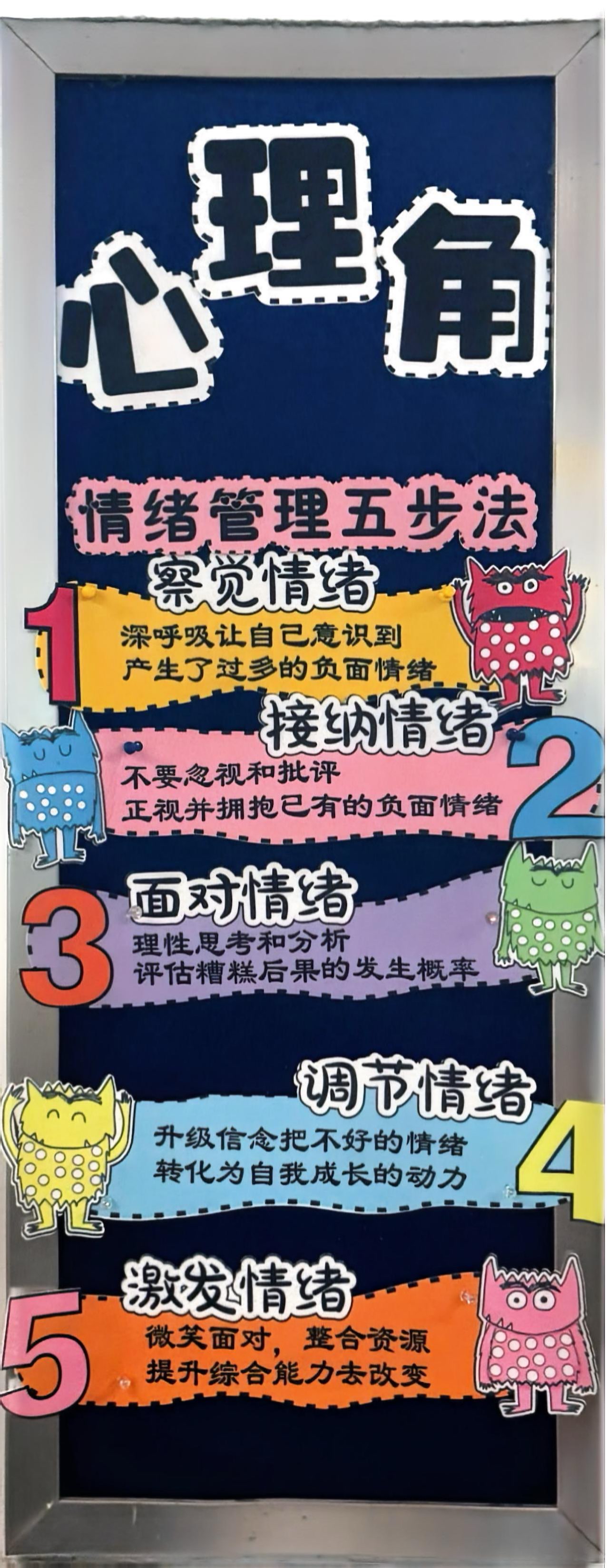 中队角与侧墙的布置则进一步丰富了班级文化的层次。各班级中队角规范陈列队旗、队徽,张贴队员风采照片,强化了少先队员的身份认同与集体荣誉感。侧墙设计更是创意十足:部分班级延续“互动化”思路,增设班级信箱,方便师生、生生间传递心声;更多班级结合心理健康教育需求,开设专属专栏,或张贴学生的情绪绘画,或展示心理调节小技巧,让心理健康教育融入日常。