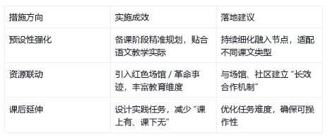 基于听课反馈梳理的问题,课题团队迅速开展研讨,制定学科类(语文)革命传统教育改进措施。措施围绕三大核心:一是强化革命教育渗透的 “预设性”,要求教师在备课阶段就精准规划教育内容与融入节点,避免课堂上学生脑袋空空进课堂;二是推动课堂联动校内外资源,计划引入红色场馆线上资源、革命先辈事迹纪录片等,丰富革命教育维度;三是注重革命教育从课堂延伸到课后,设计 “红色故事分享会”“革命精神手抄报”等实践任务。
